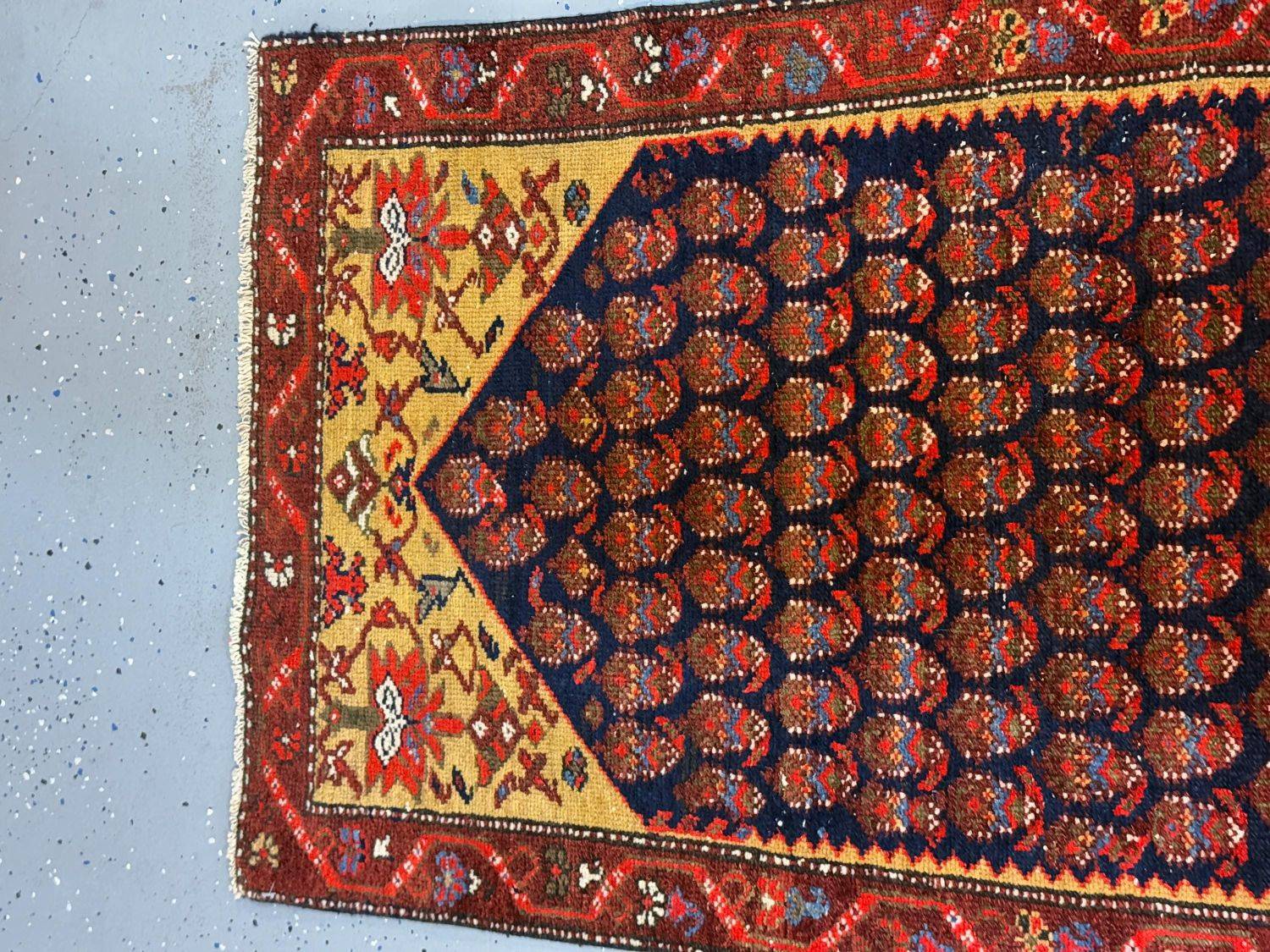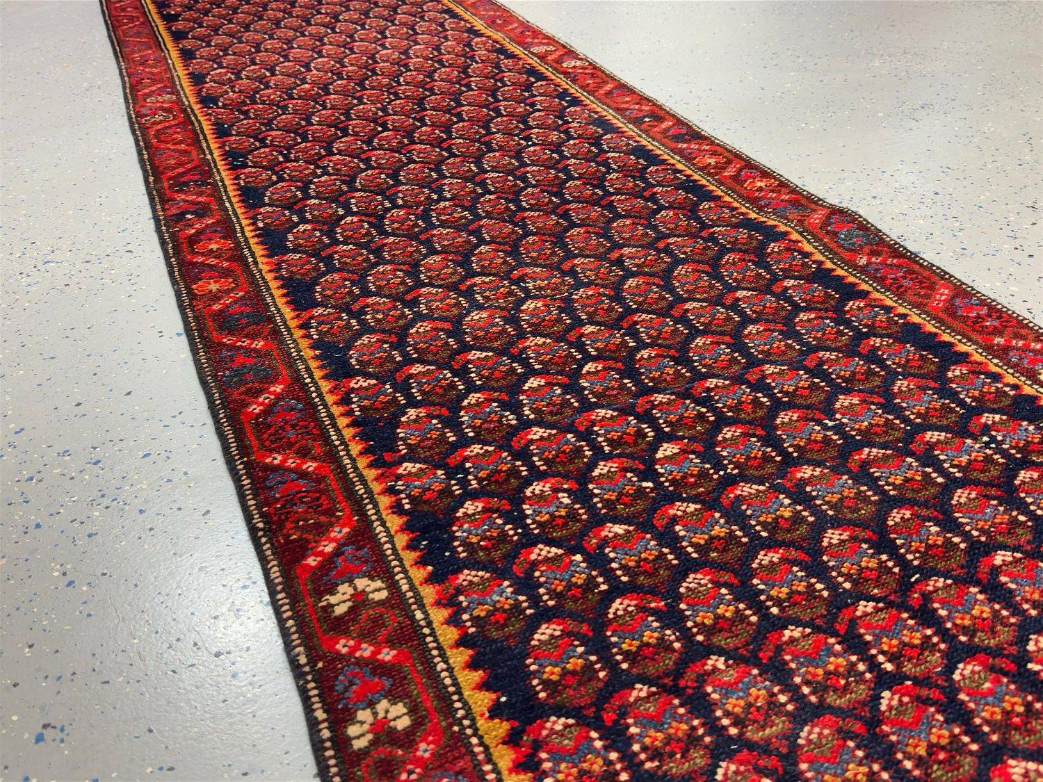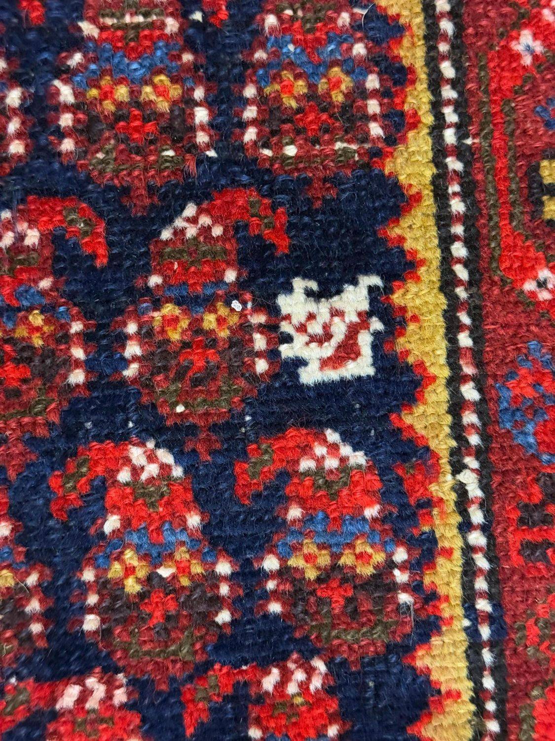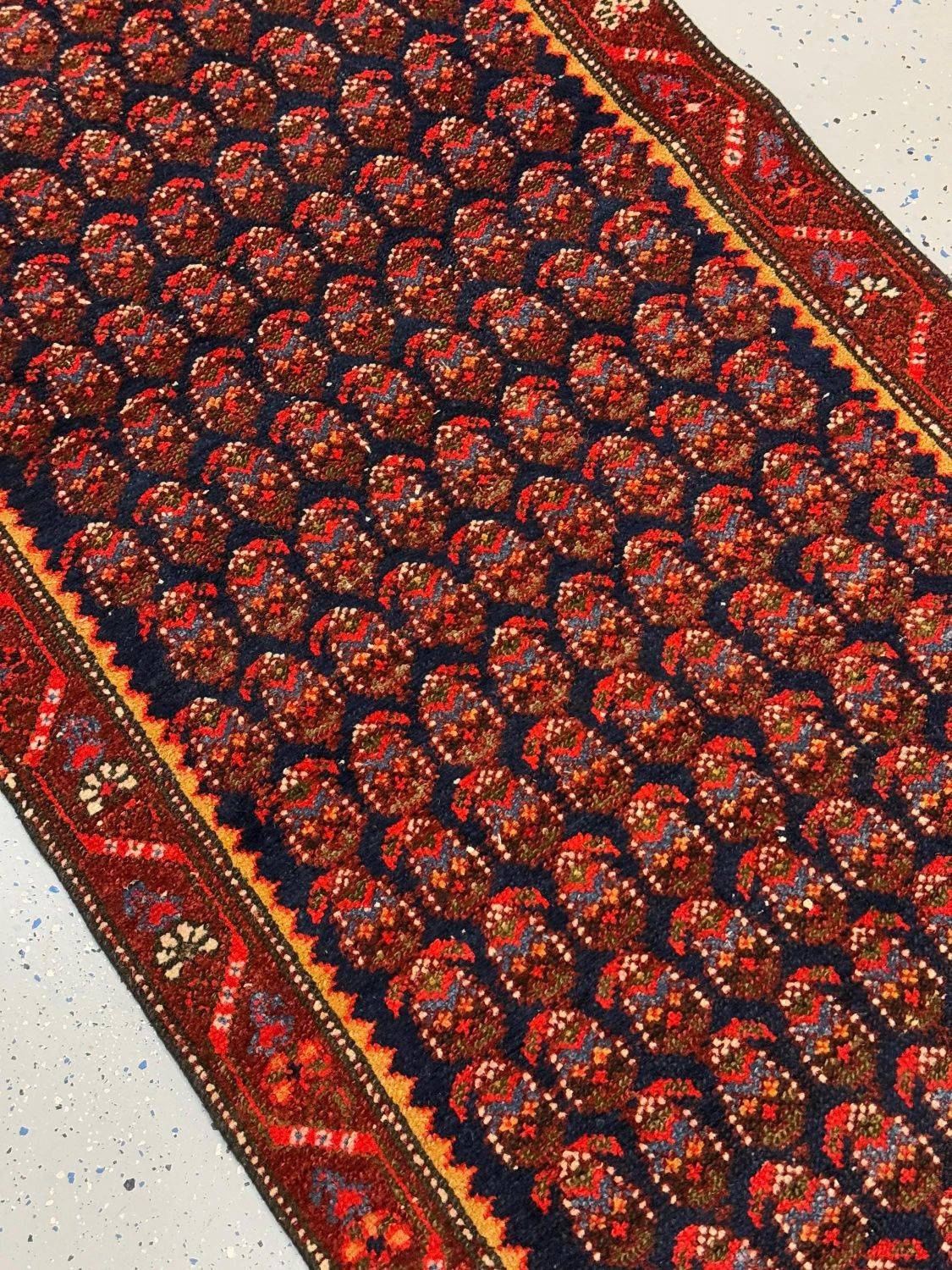 Traditional Persian Motifs: The intricate design showcases a repetitive “boteh” pattern (paisley-inspired teardrop shapes) symbolizing eternity and life, bordered by vibrant floral and geometric elements.